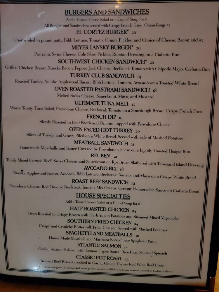 Located in Las Vegas, Siegel’s 1941 is a cocktail bar and restaurant with a diverse menu offering breakfast, brunch, and American cuisine. The restaurant provides various amenities such as reservation options, delivery, takeout services, and a welcoming atmosphere for walk-in guests. With a wide range of vegetarian options and accessibility features, Siegel’s 1941 caters to a diverse clientele. The menu includes starters like Shrimp Cocktail and Crispy Chicken Tenders, and salads such as Caesar Salad and Turkey Cobb. Their deli section features Housemade Oven Roasted Turkey Breast and Tuna Salad Sandwich. The restaurant also offers a full bar, outdoor seating, and entertainment options like pool tables. With its casual atmosphere and delicious food options, Siegel’s 1941 is a must-visit spot in Las Vegas.