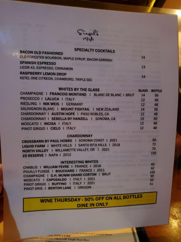 Siegel’s 1941 Menu